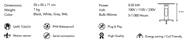 Vireoo – Professionel er vores miljøvenlige udendørs terrassevarmer udviklet og designet specielt til kontraktmarkedet. Vores varmeelement er integreret i bordbenet, hvorfra behagelig varme spredes til benene og op gennem resten af kroppen.